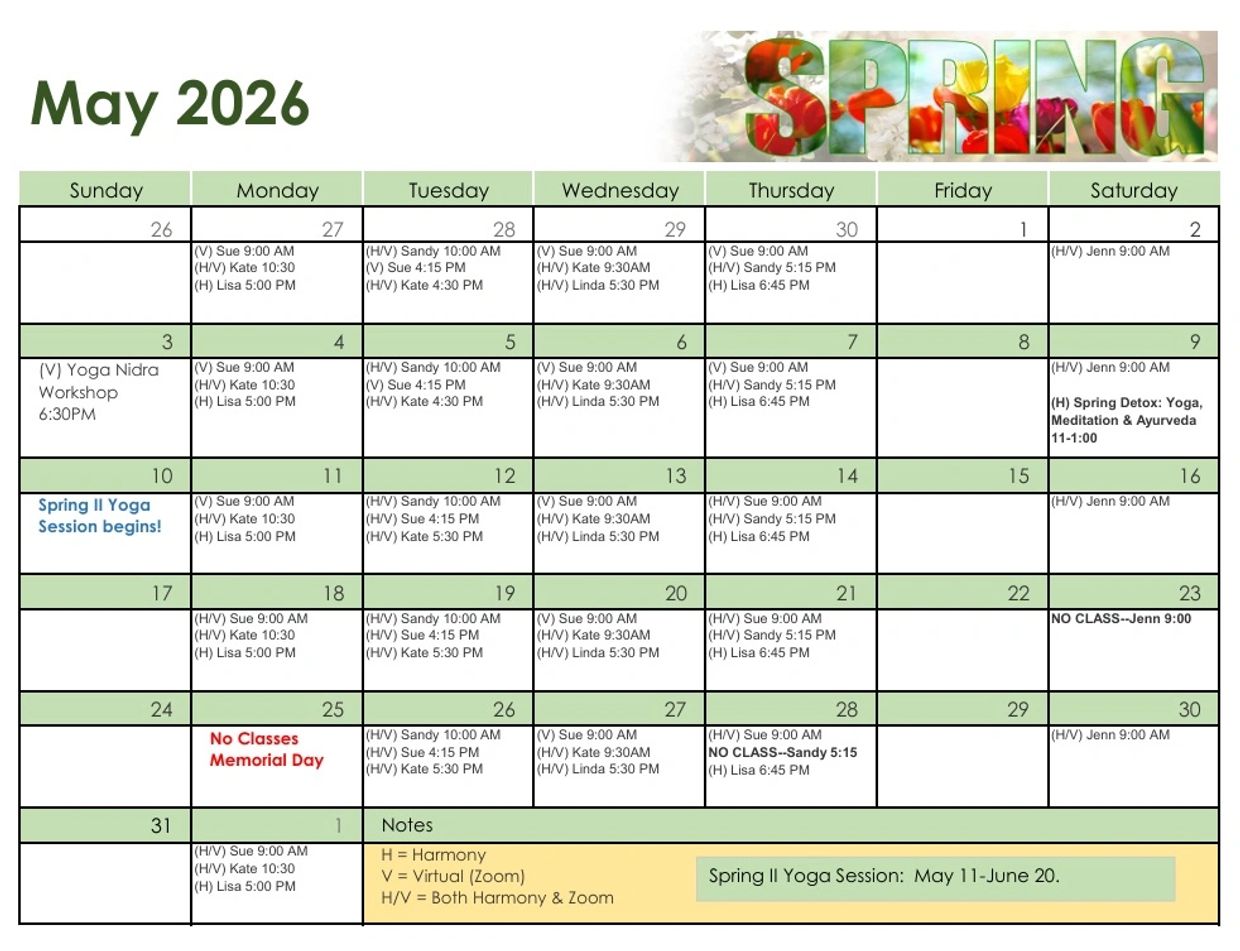Sandy is offering yoga thru Zoom and at Harmony. If you want to practice thru Zoom, you will receive a link from Sandy to get you started. You don't need a zoom account to participate.